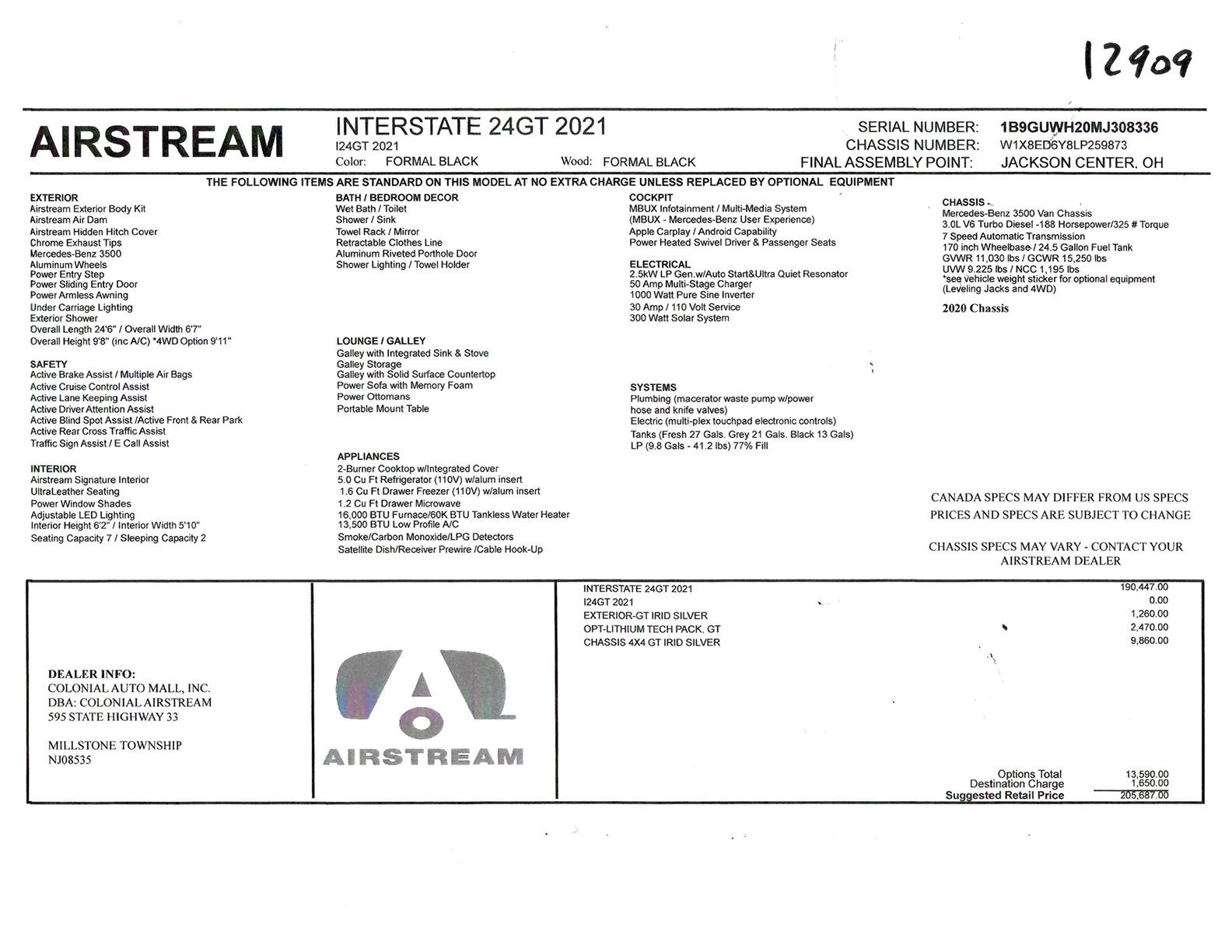 Mercedes-Benz® Sprinter 3500 • Mercedes-Benz® 3.0L V6 Turbo Diesel • BlueTEC SCR Technology, 50 State – EPA/CARB Standards • 188 HP / 325 lbs torque • 7 Speed Automatic • 170” Wheelbase • GVWR 11,030 lbs / NCC 1,195 lbs • UVW 9,416 lbs / OCCC 1,614 lbs • 24′ 6″ Exterior length • 6’7” Exterior Width • 9’8” Exterior Height (9’ 11” 4X4) • Multiple Safety Air Bags • Active Brake Assist • Active Lane Keeping Assist • Active Blind Spot Assist • Active Cruise Control Assist • Active Driver Attention Assist • Active Rear Cross Traffic Assist • E-Call Assist • Traffic Sign Assist • Front & Rear Parktronic Parking Assist • Wet Wiper System • Rear Camera Assist