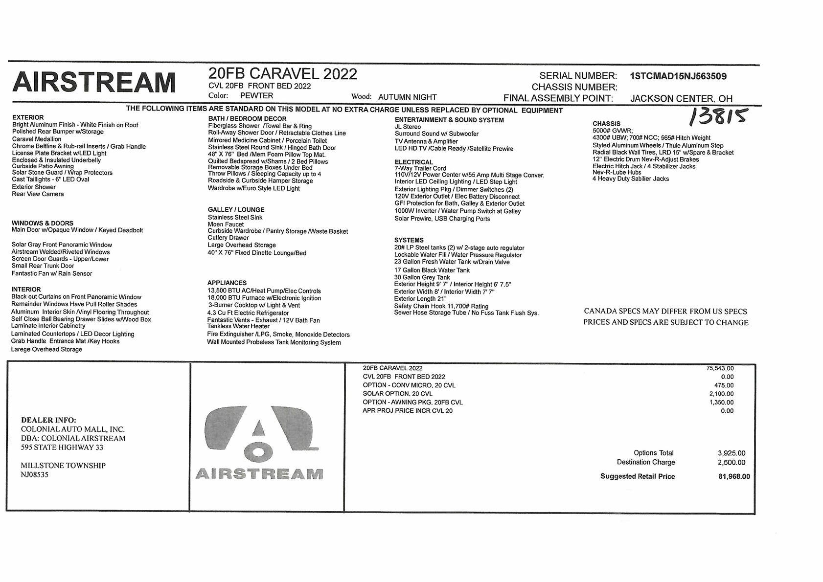 Optional Airstream Power Plus™ • Airstream Logo Entrance Mat • Fire Extinguisher • LP, Smoke & Carbon Monoxide Detectors • Built In Winterization Kit • TRA Certified Green: Emerald Status (Highest Rating) • Internally Routed A/C Condensation Drain Line to Wheel Well • 3 Year Airstream Limited Warranty (Transferable) • 3 Year 24/7 Coach-Net® Roadside Assistance