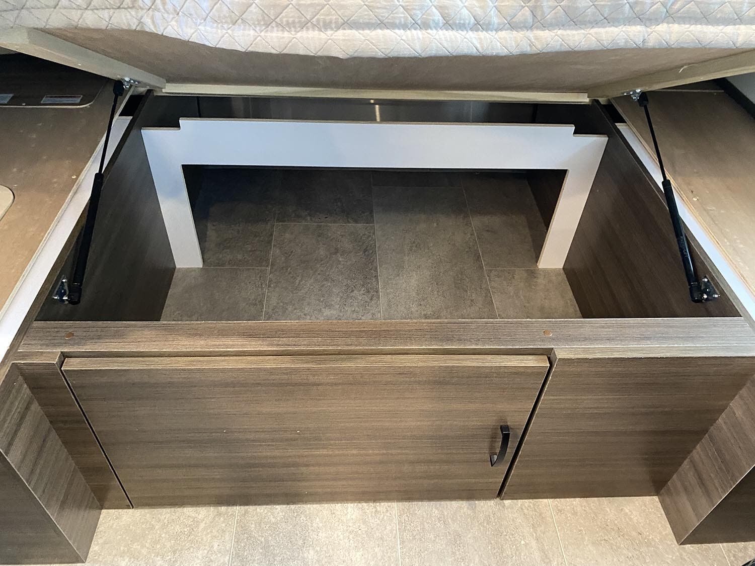 Pillow Top Memory Foam Mattress • Quilted Bedspread • Decorative Throw Pillows • Sleeping Pillows • Reading LED Lights • Under Bed Storage • Overhead Storage with Sliding Doors • Wardrobe with Hanging Bar • LED HD TV (Shared with Lounge) • Blackout Curtain(s)