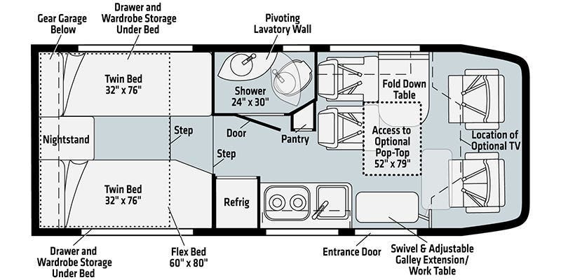 Twin beds w/WinnSleep™ System • Flex bed kit • Wardrobe/drawer storage below beds • Metal clothes rod • Room divider curtain • Reading lights • 110V, 12V, USB charging ports