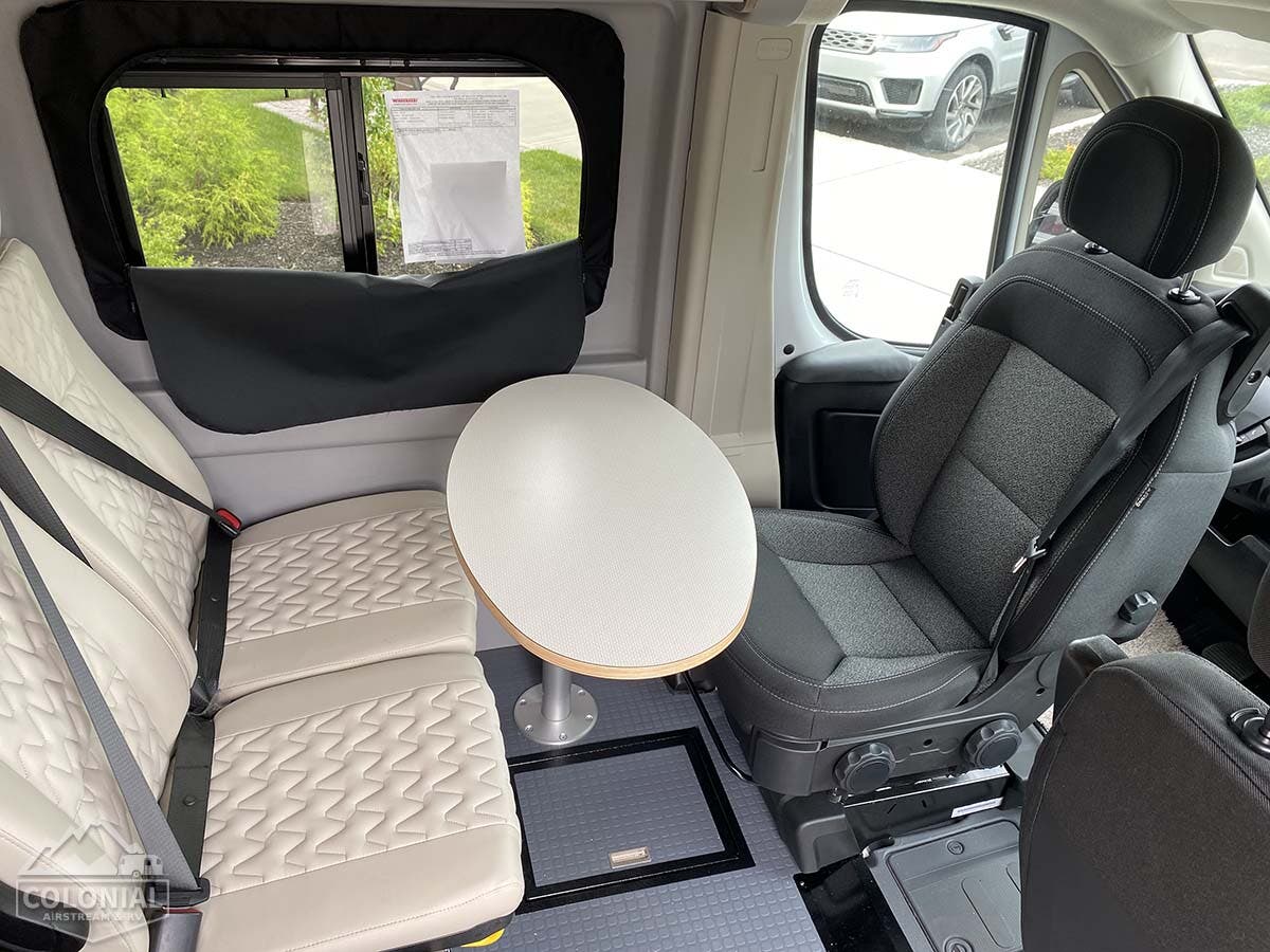 LED ceiling lights • Tinted coach windows • Systems monitor panel • Roof vent (Pop-top sleeping area) • Deluxe powered ventilator fan (59PX without pop-top) • Removable pedestal table • Below floor storage (lounge) • Reading lights • Roof wiring access port • Dinette seating w/3-point seat belts • USB charging ports • Zipped window coverings • Heavy duty vinyl flooring throughout • Ladder • Gear space w/L-track cargo tie down system (59PX)
