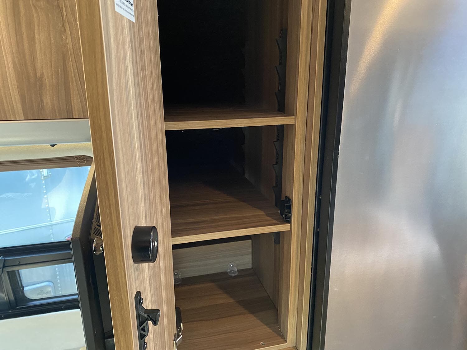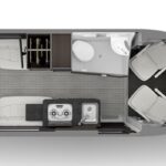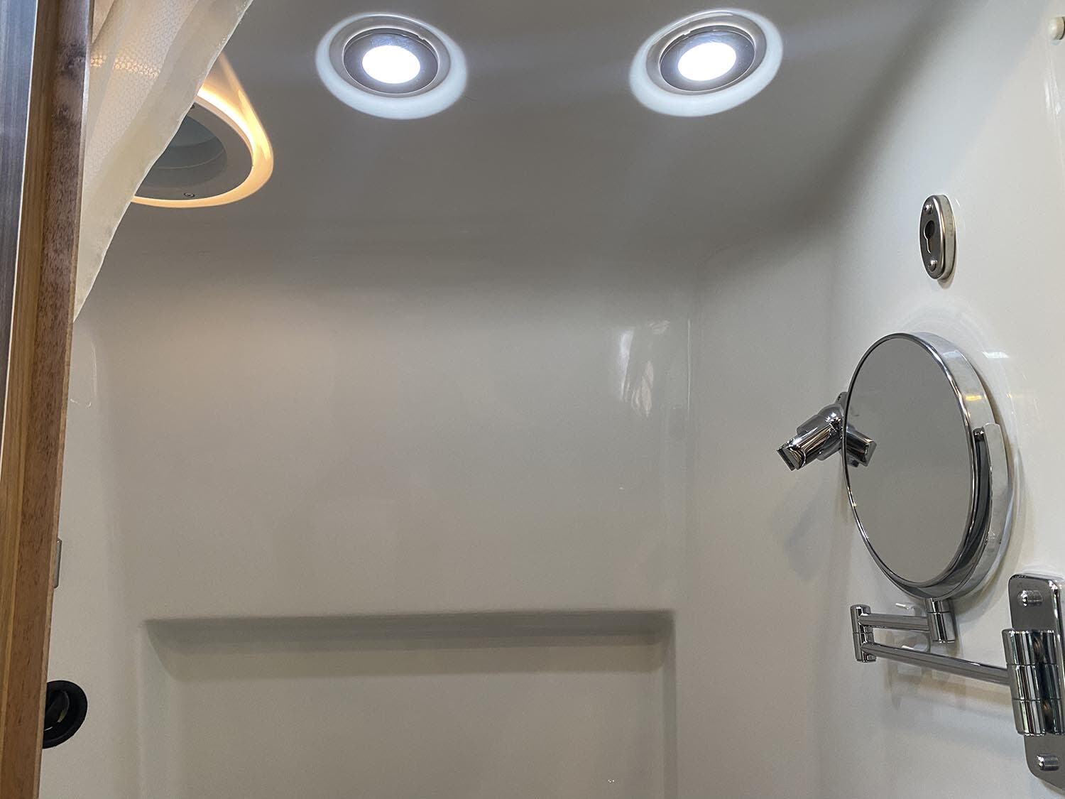 Toilet • Shower • Sink with Articulated Mirror • Riveted Aluminum Porthole Door • Retractable Clothes Line • Towel Rack • LED Shower Lights