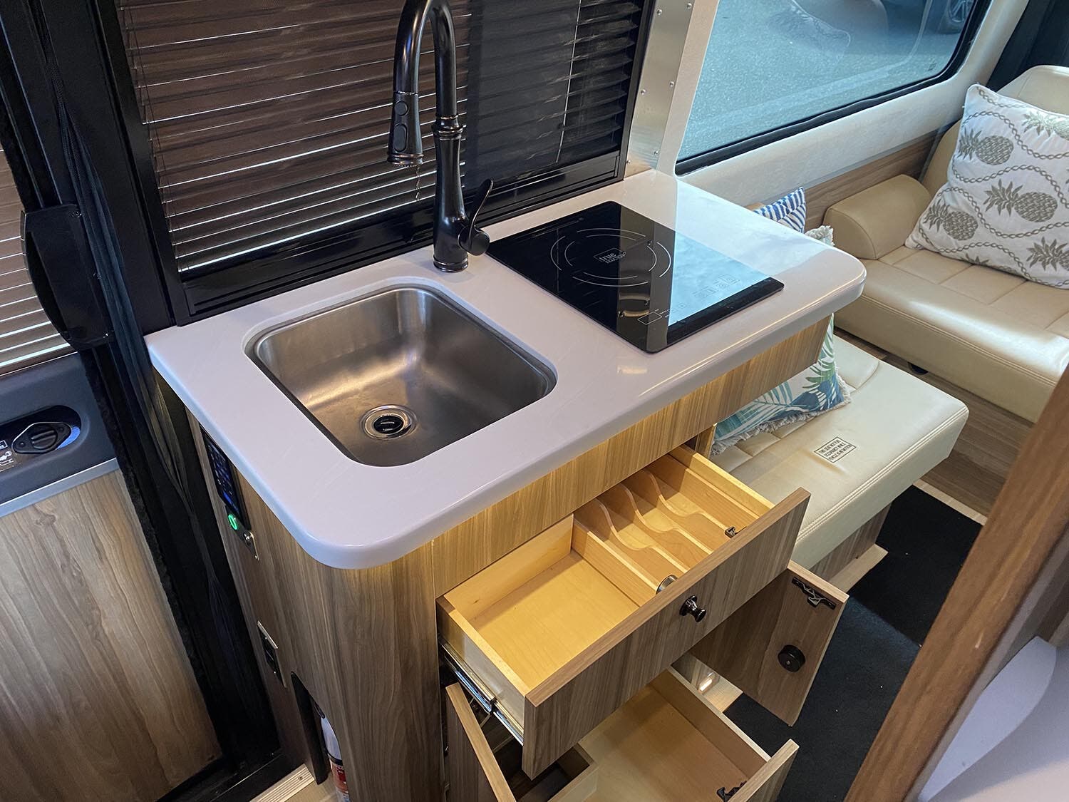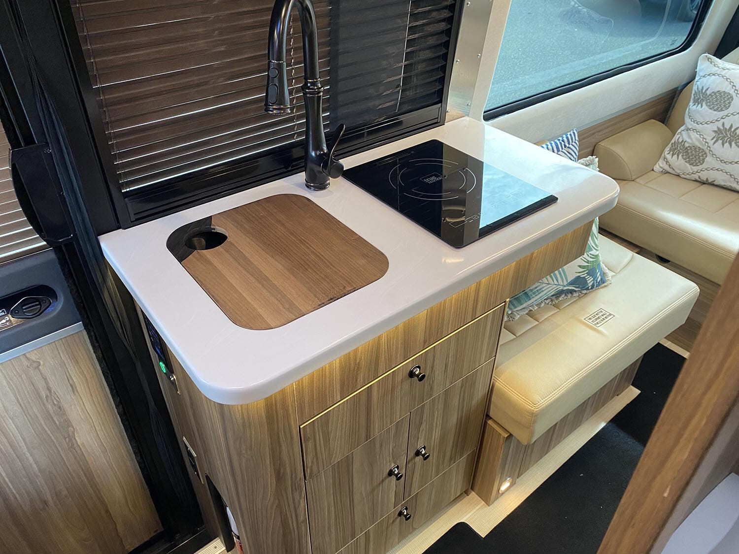 Dupont Corian® Countertop with Backsplash • Corian® Galley Slide-Out Shelf • Sink with Integrated Cover • Cooktop with Integrated Cover • Under Counter Lighting