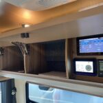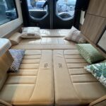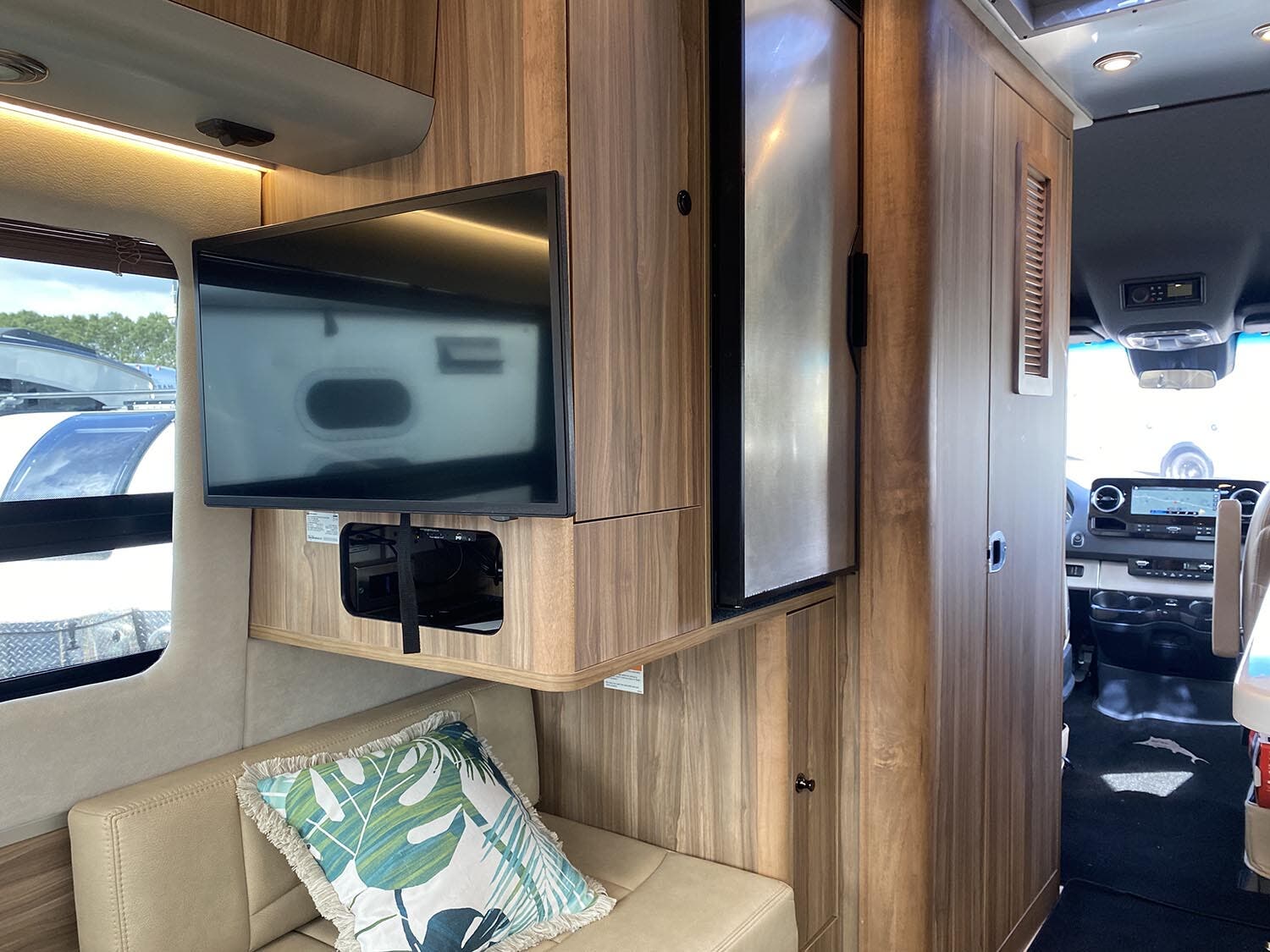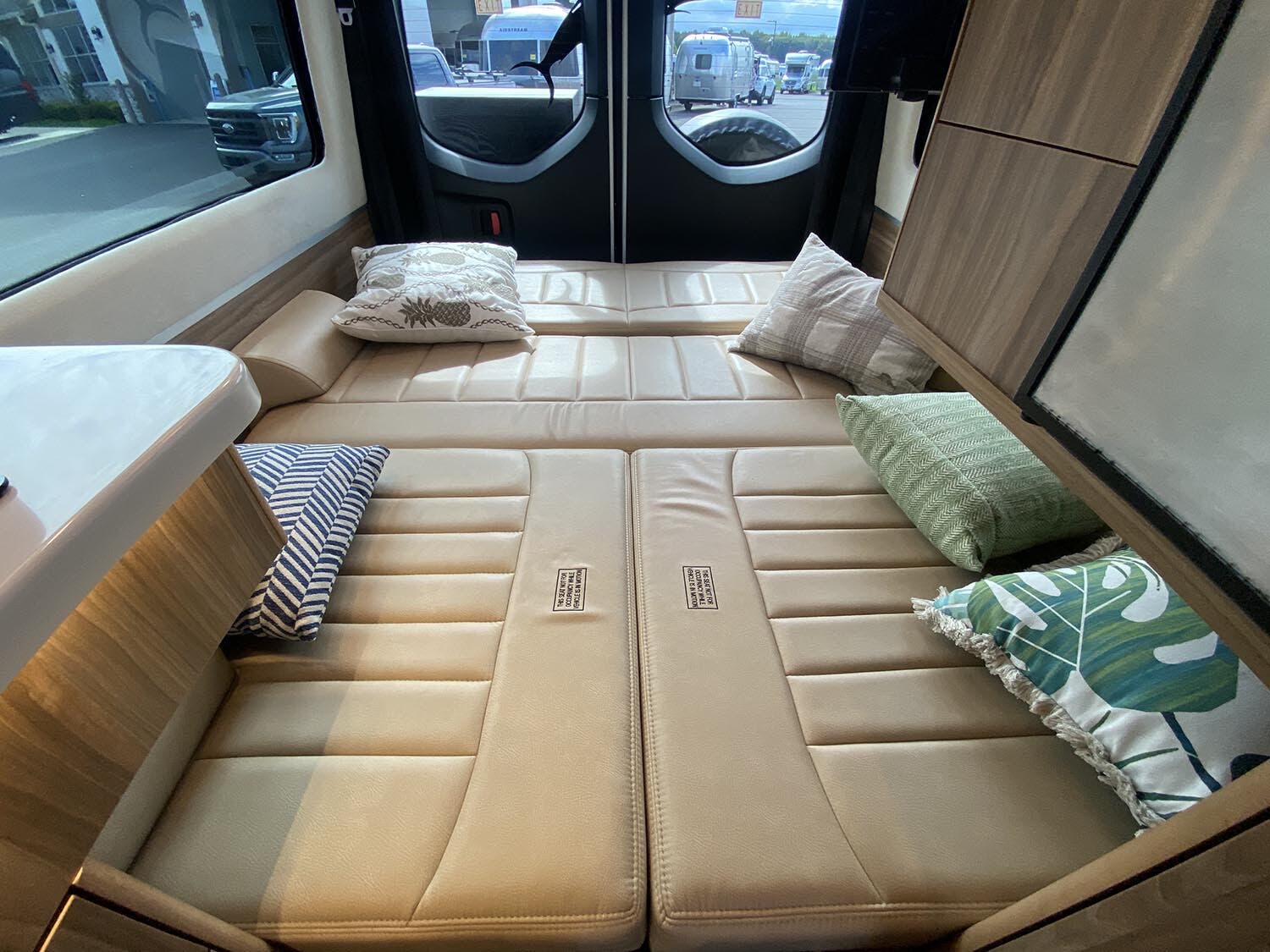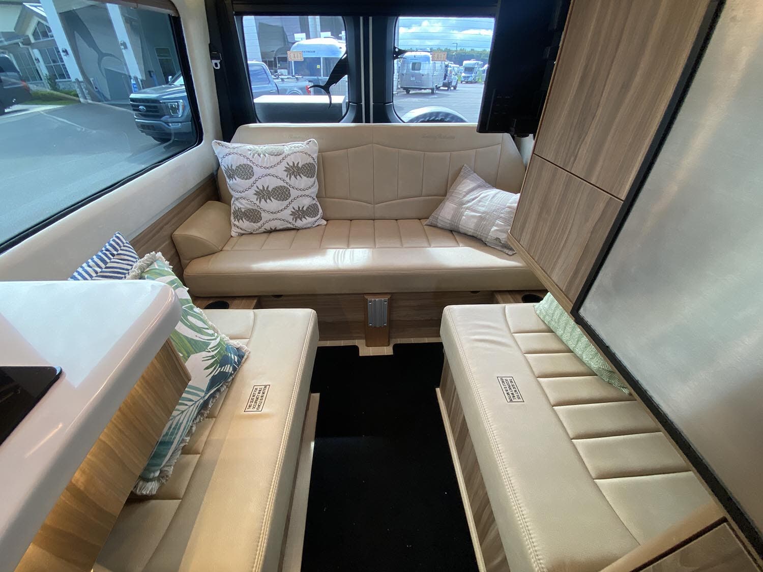 Signature Aluminum Ceiling & Trim • Matte Finish Laminate Cabinetry • Flush-Mount & Solid Shut Cabinets • Ultraleather Seating • Vinyl w/Urethane Covering on Walls & Windows • Power Window Shades • Marine Woven Synthetic Flooring • Adjustable LED Lighting • Adjustable Swivel Table (1) • LED Widescreen HDTV • Power Rear Sofa Converts to Lay Flat Bed • Power Ottomans • USB Charging Ports • Fantastic Fan with Rain Sensor • Interior Height 6’ 2.25” • Interior Width 5’ 10”