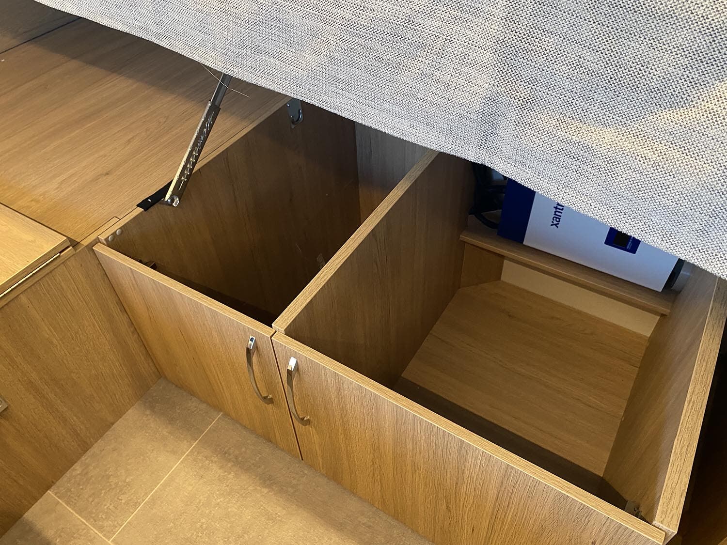 Coach Floor Extension • Curved Soft Close Overhead Cabinetry Doors with Hidden Catch • Dry Chemical Fire Extinguisher • Full Extension Ball Bearing Soft Close Drawer Tracks • Illuminated Assist Handle • LED Aisle Lighting and Hidden Accent Lights Above Cabinet with Dimmer • LED Ceiling Light Panels with Dimmer in Bedroom and Living Areas • LED Recessed Strip Lighting with Dimmer Under Overhead Cabinets • Opening Skylight with Screen and Shade • Roller Shades • Smoke, LP, and CO Detectors • Soft Vinyl Ceiling Headliner • Tile Look Vinyl Flooring Throughout