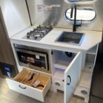 3 Burner Gas Cooktop (20, 22); 2 Burner Gas Cooktop (16, 19) • Baraldi Cooking Vent with Light • Laminate Galley Top • Stainless Steel Sink • Laminate Dinette Top • Ultraleather® Dinette Cushions • Dinette Converts to a Lounge and Sleeping Accommodations • Flatware Organizer • JL Stereo with Bluetooth®, Surround Sound and Subwoofer • 12-volt 24” Smart TV W/Bluetooth compatibility • Blu–Ray™ DVD Player • Aluminum Roller Blinds • Moen® Faucet