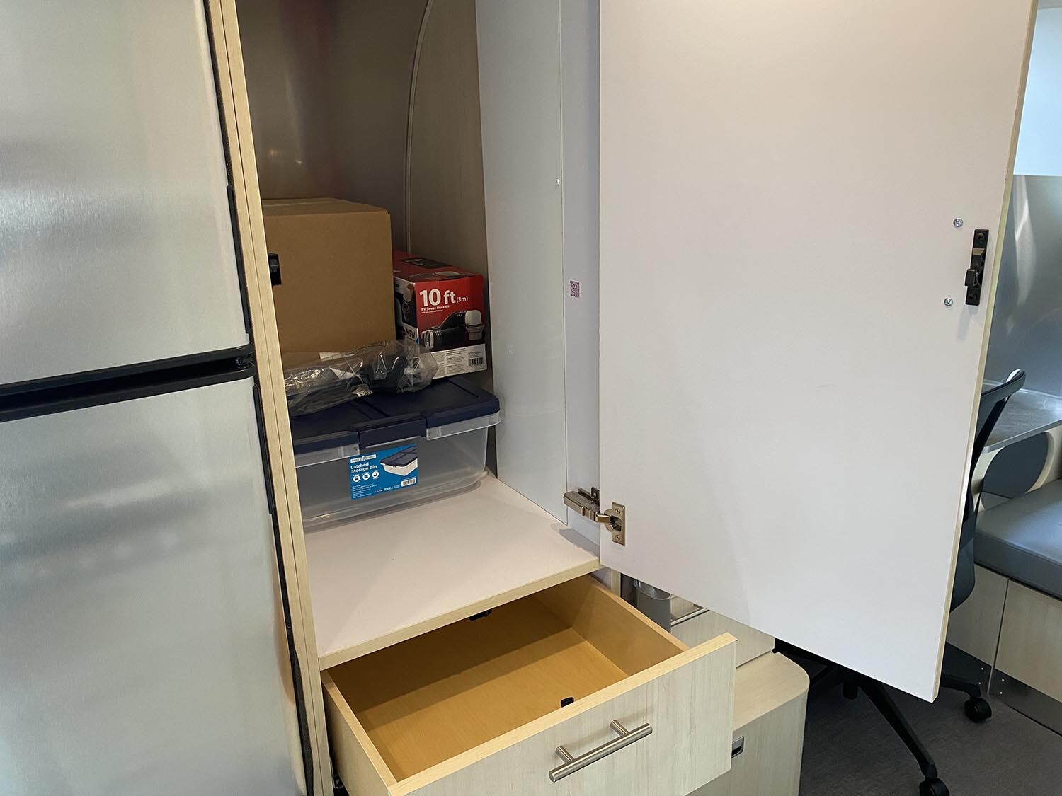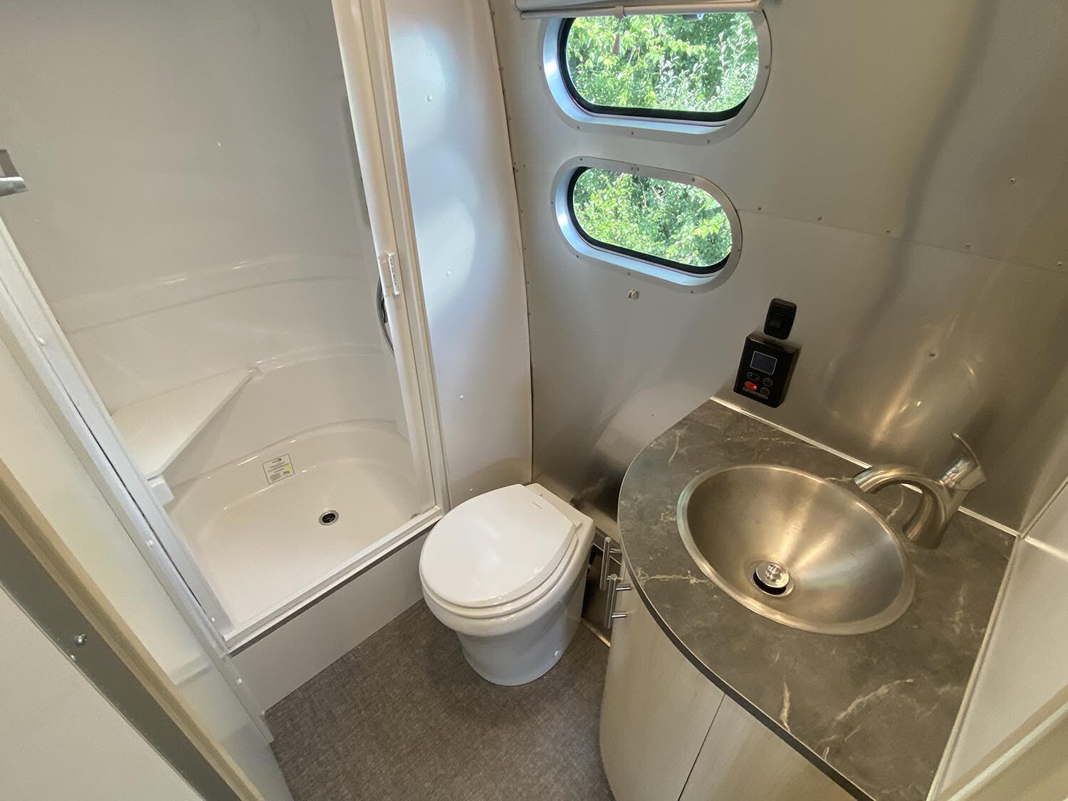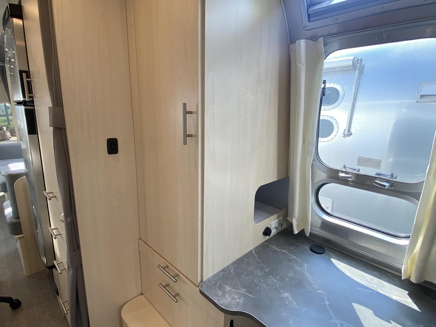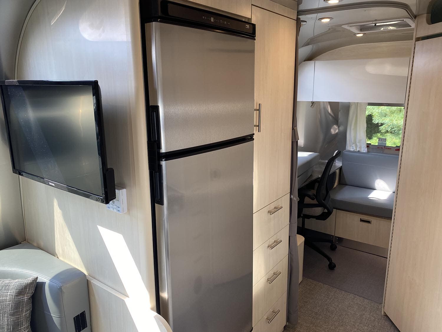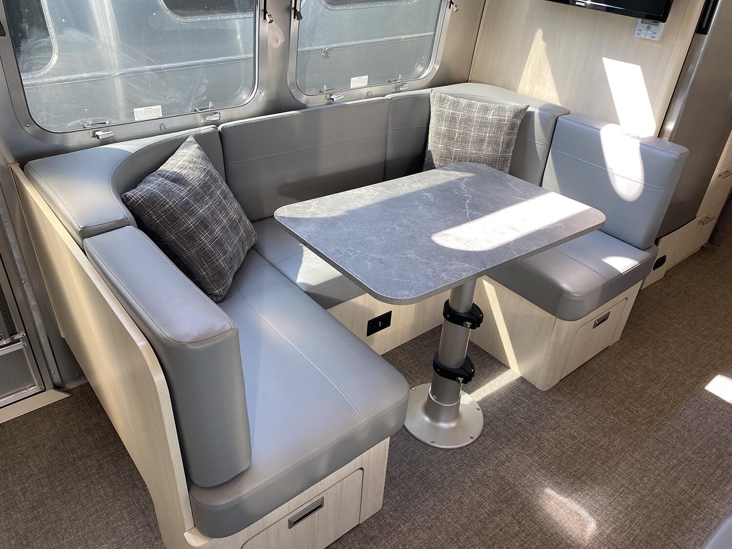 Complete Aluminum Interior Walls and Ceiling • Quietstream™ A/C with Heat Pump & Electronic Thermostat • Fantastic© Fan with Thermostat & Automatic Rain Sensor • Probeless Tank Monitoring System • EcoBatt™ Insulation • Handcrafted Aluminum Screen Door with Guards • Panoramic Front Windows with Blackout Shades • Handcrafted Italian Lite-Ply Laminated Cabinetry • Seamless Vinyl Flooring • LED Interior Lighting with Dimmer • Tankless On Demand LP Water Heater • Overhead Storage with Heavy Duty Hinges • 2000W Pure Sine Inverter • Coat & Key Hooks • Airstream Connected Pre-wire