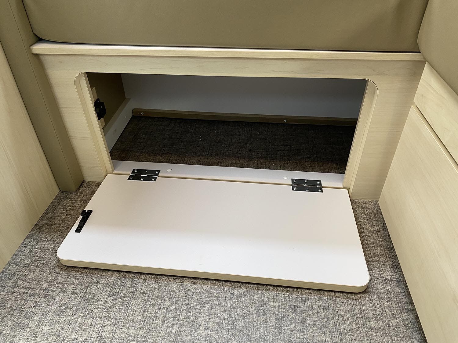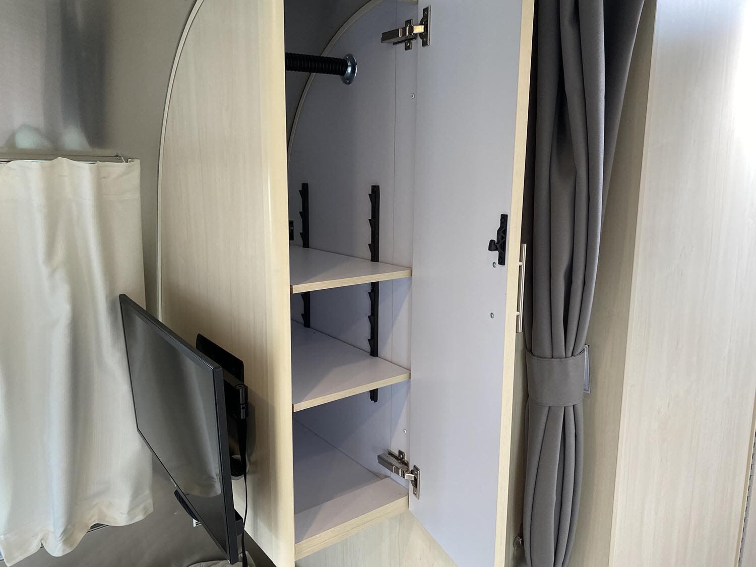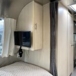 Choice of Either Queen or Twin Beds in 25′ and Larger Models • Front Bunk Bed option (25FB and 27FB only) • Pillow Top Memory Foam Mattress • Quilted Bedspread • Decorative Throw Pillows • Sleeping Pillows • Reading LED Lights • Under Bed Storage • Overhead Storage with Heavy Duty Hinges • Wardrobe with Hanging Bar • 12-volt 24” Smart TV W/Bluetooth compatibility (Single Sharable TV in 23’ models) • Blackout Curtain(s)