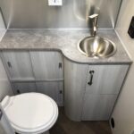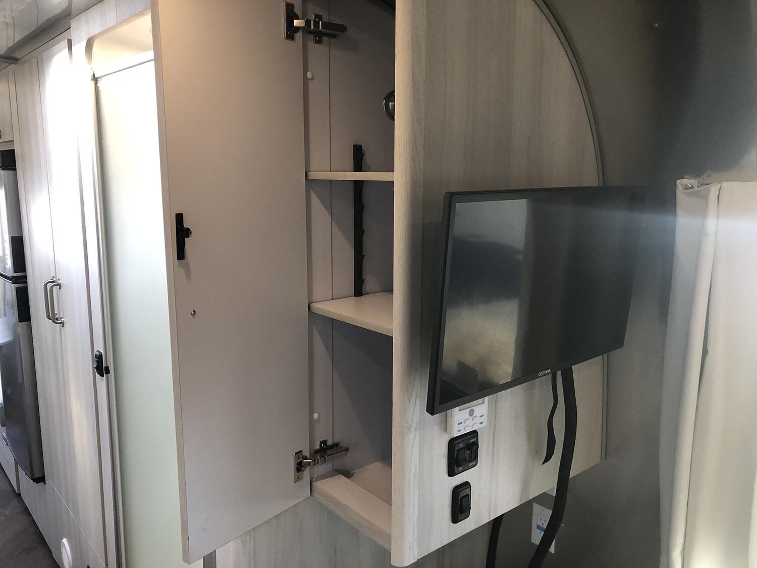 Choice of Either Queen or Twin Beds in 25′ & Larger Models • Front Bunk Bed Option (25FB and 27FB only) • Pillow Top Memory Foam Mattress • Quilted Bedspread • Decorative Throw Pillows • Sleeping Pillows • Reading LED Lights • Under Bed Storage • Overhead Storage with Sliding Doors and LED Lighting • Wardrobe with Hanging Bar • 12-volt 24” Smart TV W/Bluetooth compatibility (Single Sharable TV in 23′ models) • Blackout Curtain(s)