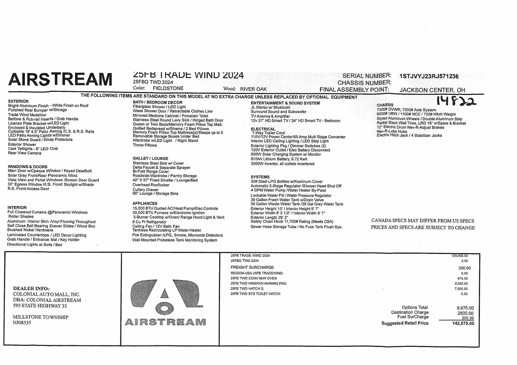 1 Year Airstream Club Explorer Membership • 3 Year 24/7 Coach-Net® Roadside Assistance • 3 Year Airstream Limited Warranty (Transferable) • Airstream Logo Entrance Mat • Built In Winterization Kit • Emergency Manual Crank for Powered Hitch Jack • Fire Extinguisher • LP, Smoke & Carbon Monoxide Detectors • TRA Certified Green: Emerald Status (Highest Rating)