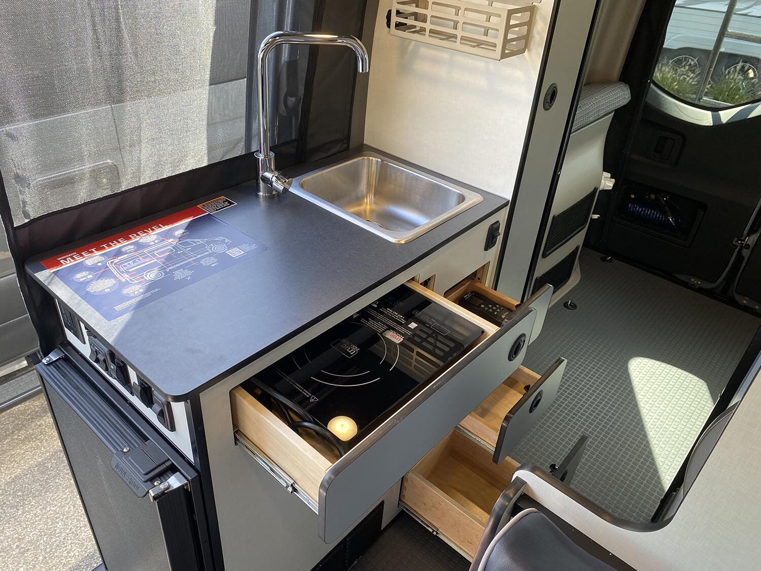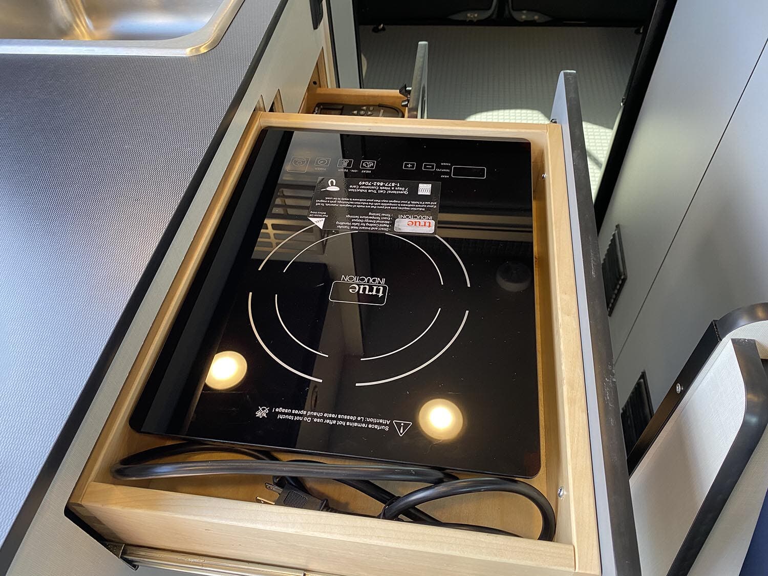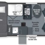 Removable counter extension • Laminate countertop • Portable single burner induction range top • 3.0 cu. ft. (12V) compressor driven refrigerator/freezer • Stainless steel sink w/single control faucet • Pantry • Removable, pedestal dinette table • Full-extension drawers