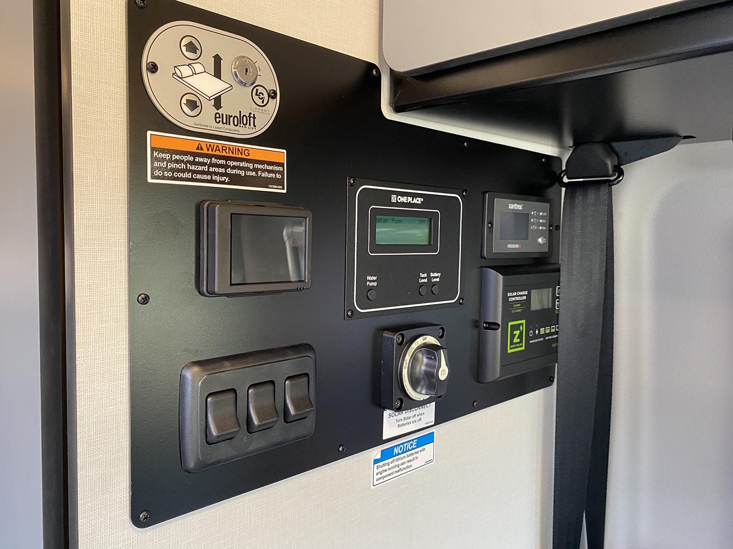 Power Lift Bed w/molded pockets and zip storage below • Under-bed gear garage storage w/six removable cargo tie-down anchors • Powered roof vent • Reading lights