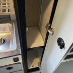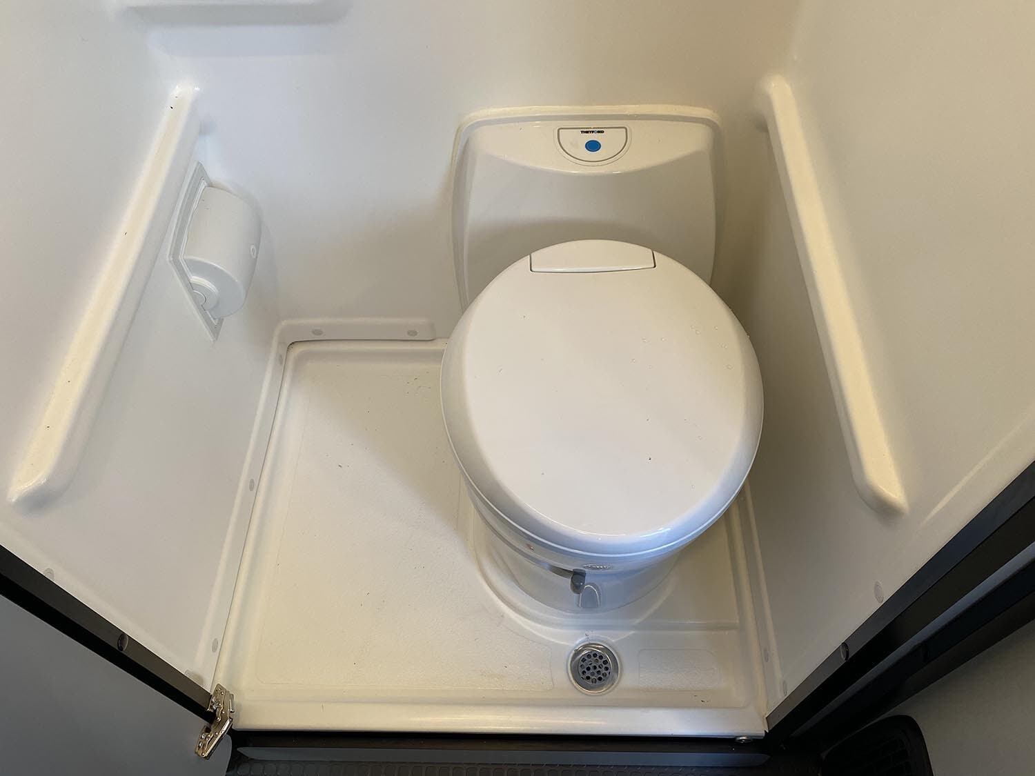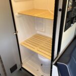 Shower w/wall surround • Flexible showerhead • Shower curtain • Wet Bath 31″x26″ • 2 removable shelves convert to wet storage cabinet • Removable clothes rod • Swiveling cassette toilet • Powered roof vent