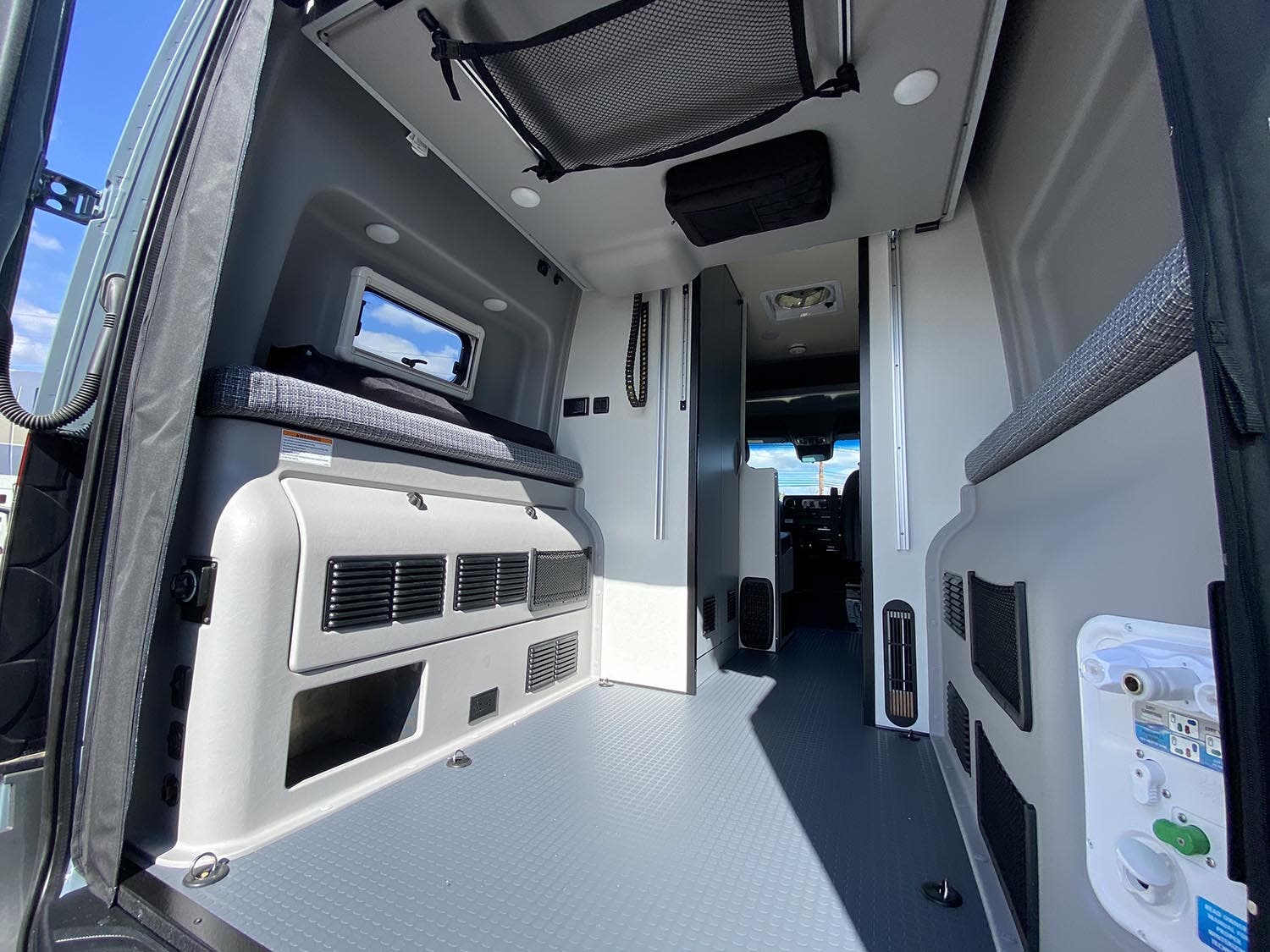 LED ceiling lights w/dimmer switch • Tinted dual-pane euro acrylic windows w/cassette shades • Deluxe powered ventilator fan w/rain cover • Systems monitor panel • USB charger points • RAM® Tough-Track™ mounts throughout • Heavy-duty vinyl flooring throughout