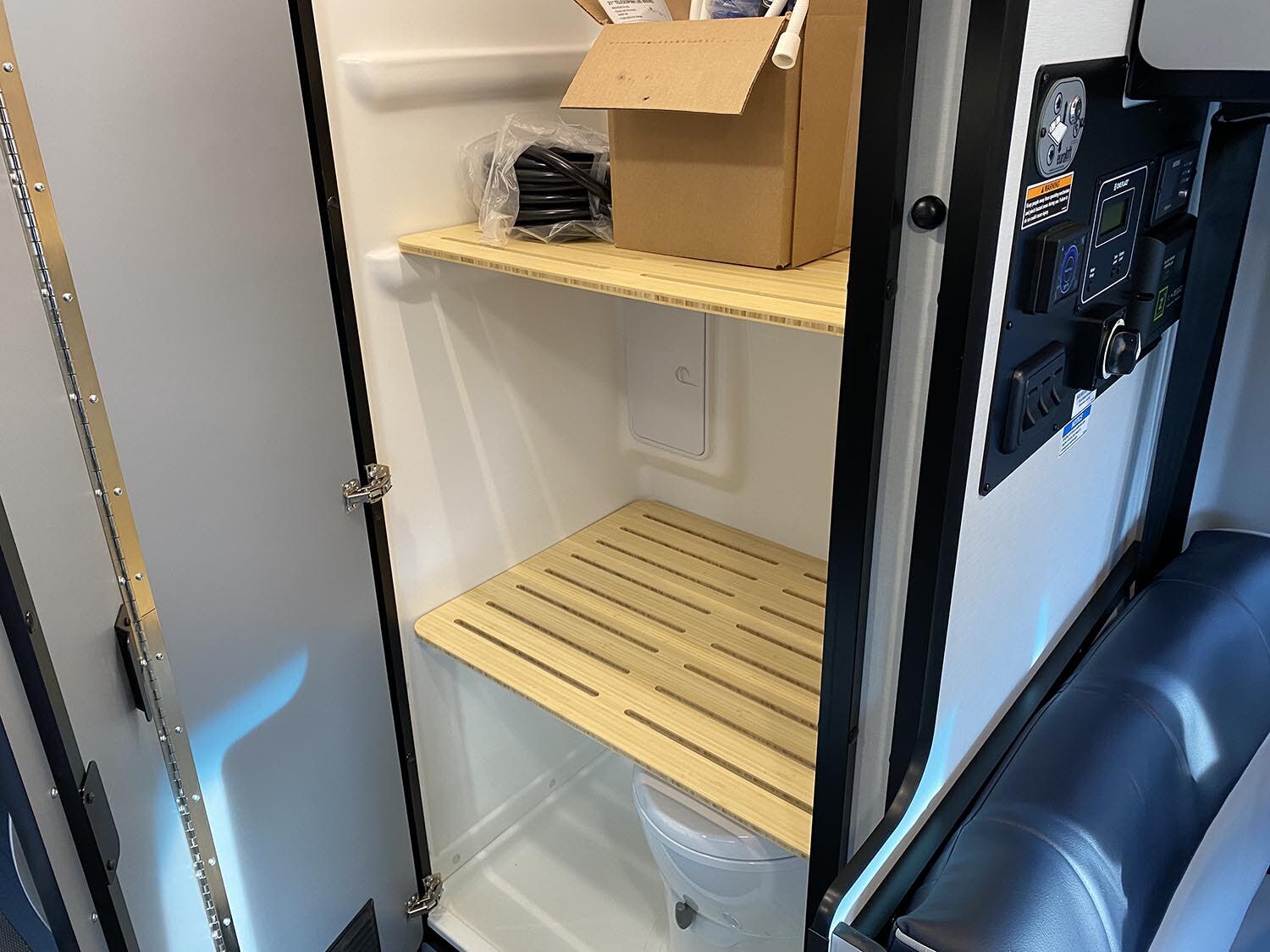 Shower w/wall surround • Flexible showerhead • Shower curtain • Wet Bath 31″x26″ • 2 removable shelves convert to wet storage cabinet • Removable clothes rod • Swiveling cassette toilet • Powered roof vent