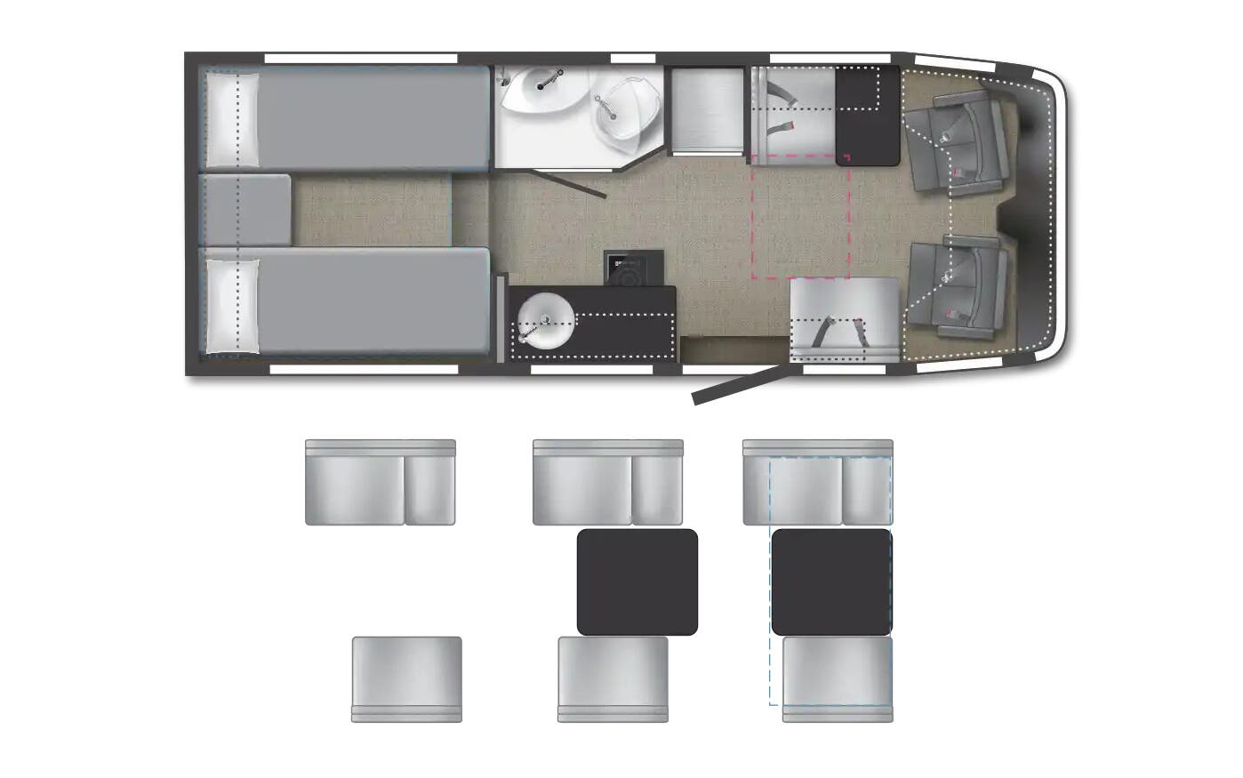 LED ceiling lights • Tinted dual-pane euro acrylic windows w/screen and cassette shade • Forward facing lounge w/3-point seat belts • Pull-up/fold down table • Removable pedestal table • Side facing fixed sofa w/lap belt • Color touchscreen systems monitor panel • Vinyl flooring throughout • Satellite system ready • Amplified digital HDTV antenna • Roof wiring access port • Assist bar • 110V, 12V, USB charging ports • Deluxe powered ventilator fan w/remote • Accent lighting