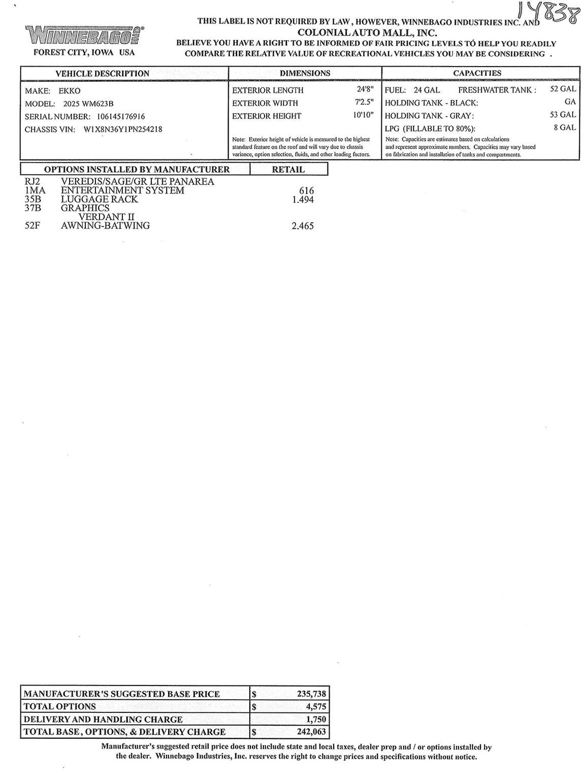 *Disclaimer: Because features, specification, equipment, and options may vary from those highlighted on this website, the buyer is responsible for confirming with the dealer the features, specifications, equipment, and options included in their specific vehicle. In addition, Winnebago’s program of continuous product improvement may result in changes to vehicle specifications, equipment, model availability, and price without notice.