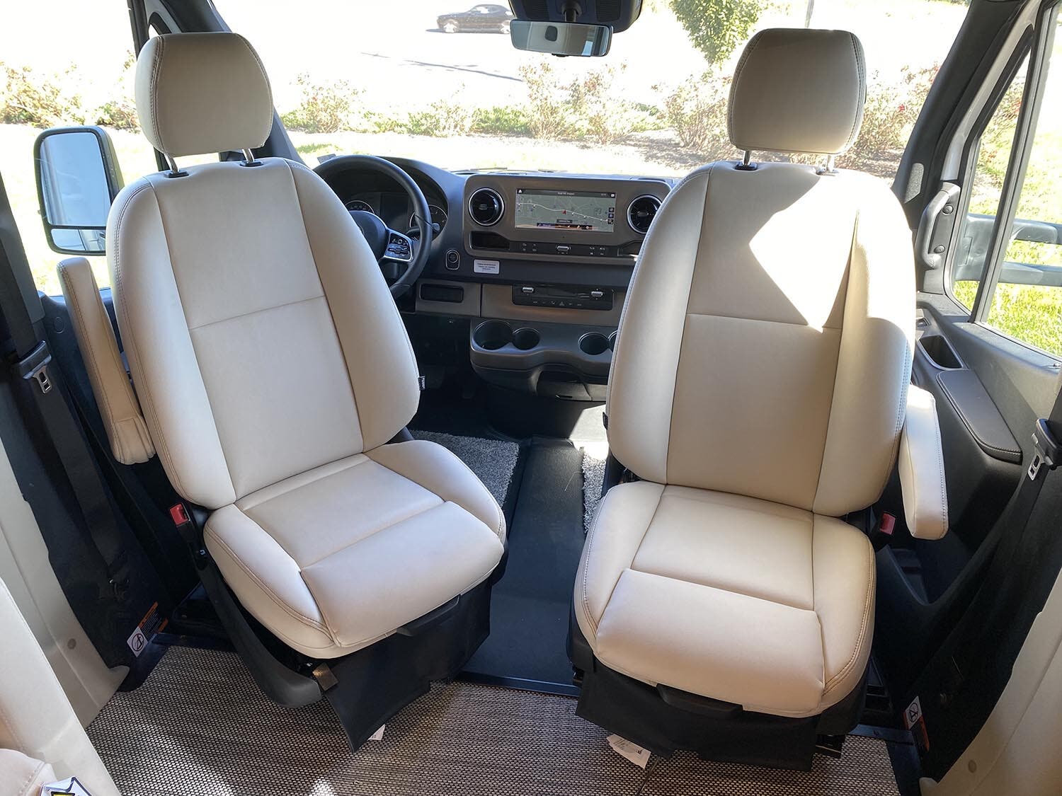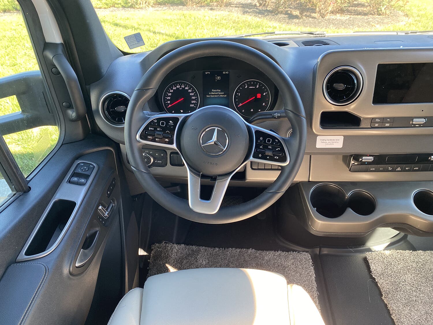 MBUX® touchscreen multimedia infotainment system with navigation, satellite radio, Wi-Fi hotspot, intelligent voice control, SiriusXM®, Apple CarPlay®, Android Auto™, Bluetooth®, and rear camera • Mercedes me connect vehicle app • Heated power control cab seats, memory control, armrest, adjustable lumbar support, headrest, recline, slide, and manual swivel • 3-point seat belts • Airbags driver, passenger, side, and curtain • Power assist steering w/tilt wheel • Digital rearview mirror • Blind spot monitoring system (late availability) • Active brake assist • Lane keeping assist • Attention assist • Hill start assist • Crosswind assist • Rain sensor w/integrated wet wiper system • DISTRONIC PLUS® (adaptive cruise control) • Power mirrors w/defrost and turn signals • Auto headlamps w/high beam assist • Automatic climate control • Power door locks w/remote • Power windows • Dash charging station w/wireless charging, 12-volt, and USB powerpoints • Dash appliqué package • Sunvisors • Thermal cab windows and windshield blinds • Leather-wrapped steering wheel • 2 cab seat lounge cushions