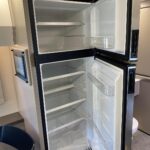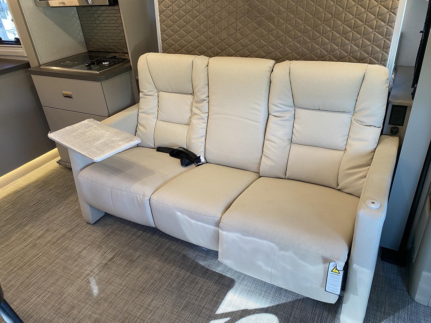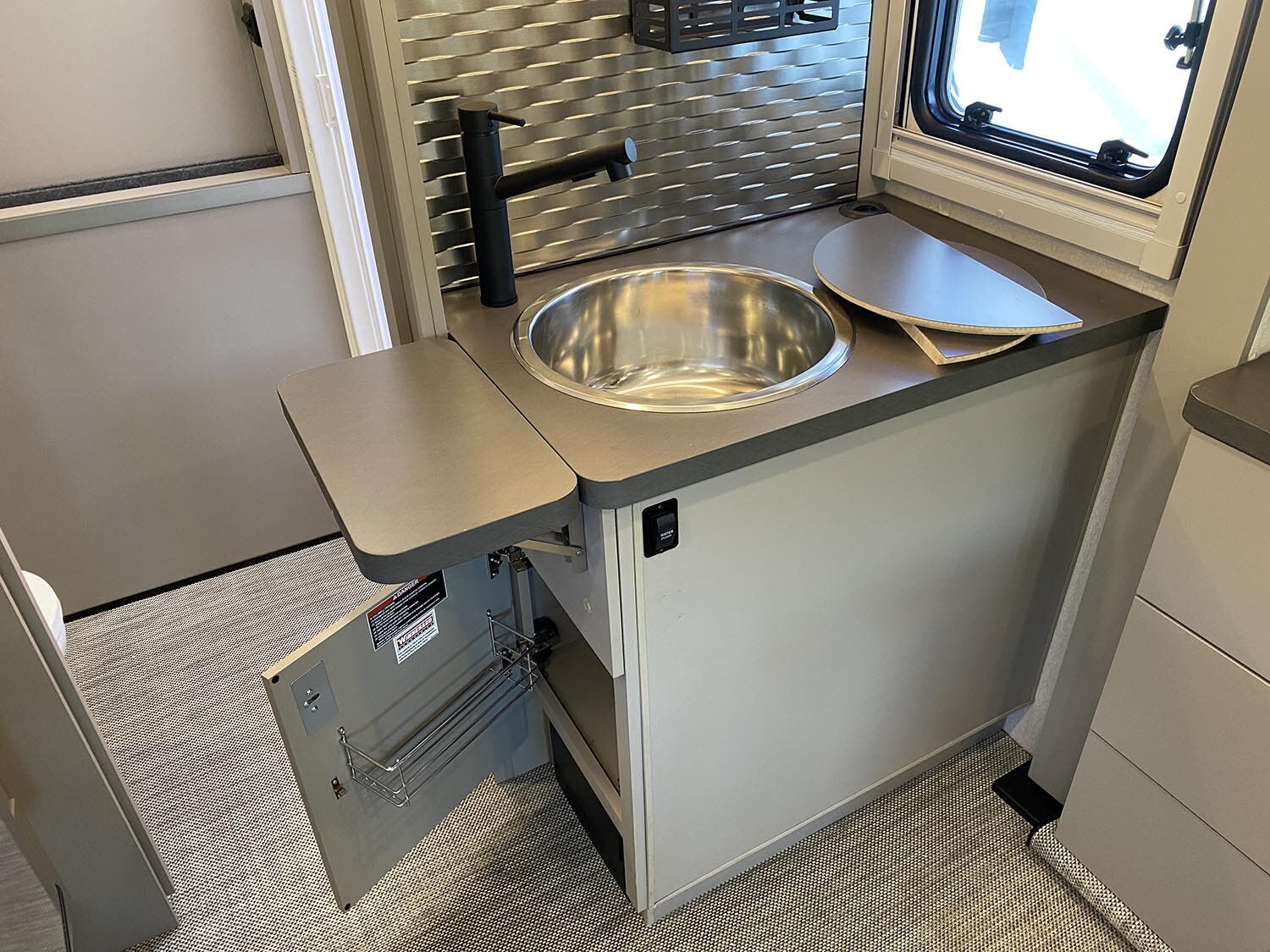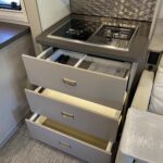 Laminate countertops • 2-burner induction & LP range cooktop • 1.6 cu ft OTR microwave/convection oven w/touch control • 10.0 cu. ft. (12V) 2-door compressor-driven refrigerator/freezer • Single stainless sink w/cover • Single control faucet w/sprayer • Pantry • Flip-up countertop extension • Pop-up outlet w/(2) 120V & (2) USB-A ports • Cold water filtration system • Water-pump switch • Mini blinds • Overhead cabinets w/dimmable LED accent lighting • Lighted soft-close drawers • Dimmable toe kick accent LED lighting