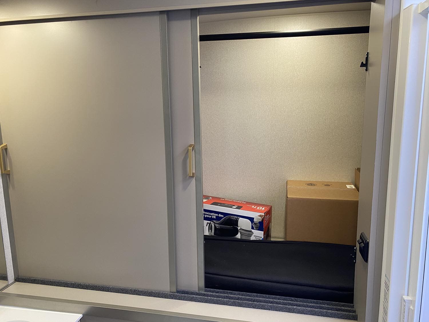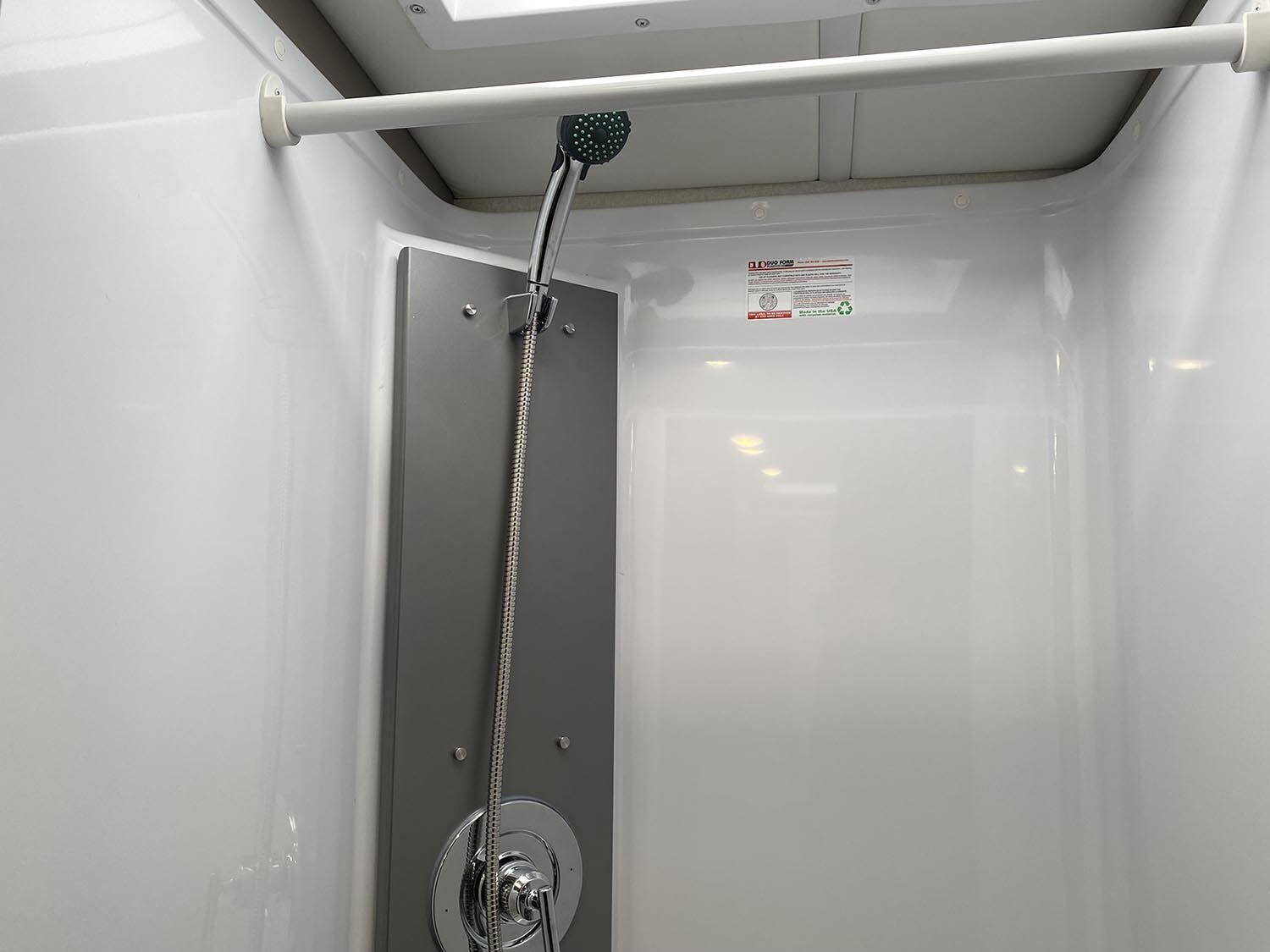 30″ x 34″ shower w/built-in seat • Retractable, self-cleaning shower screen • Hand held flexible showerhead • Shower skylight • Porcelain toilet w/foot pedal • Full width wardrobe cabinet w/sliding doors, 2 drawers, and 3 shelves • Metal clothes rod in wardrobe • Removable clothes rod in shower • Powered roof vent w/rain cover • Lavatory cabinet • Tissue holder • Lightweight solid surface countertop w/integrated round sink • Linen cabinet w/adjustable shelves • Robe hook(s) • Dimmable toe kick accent LED lighting