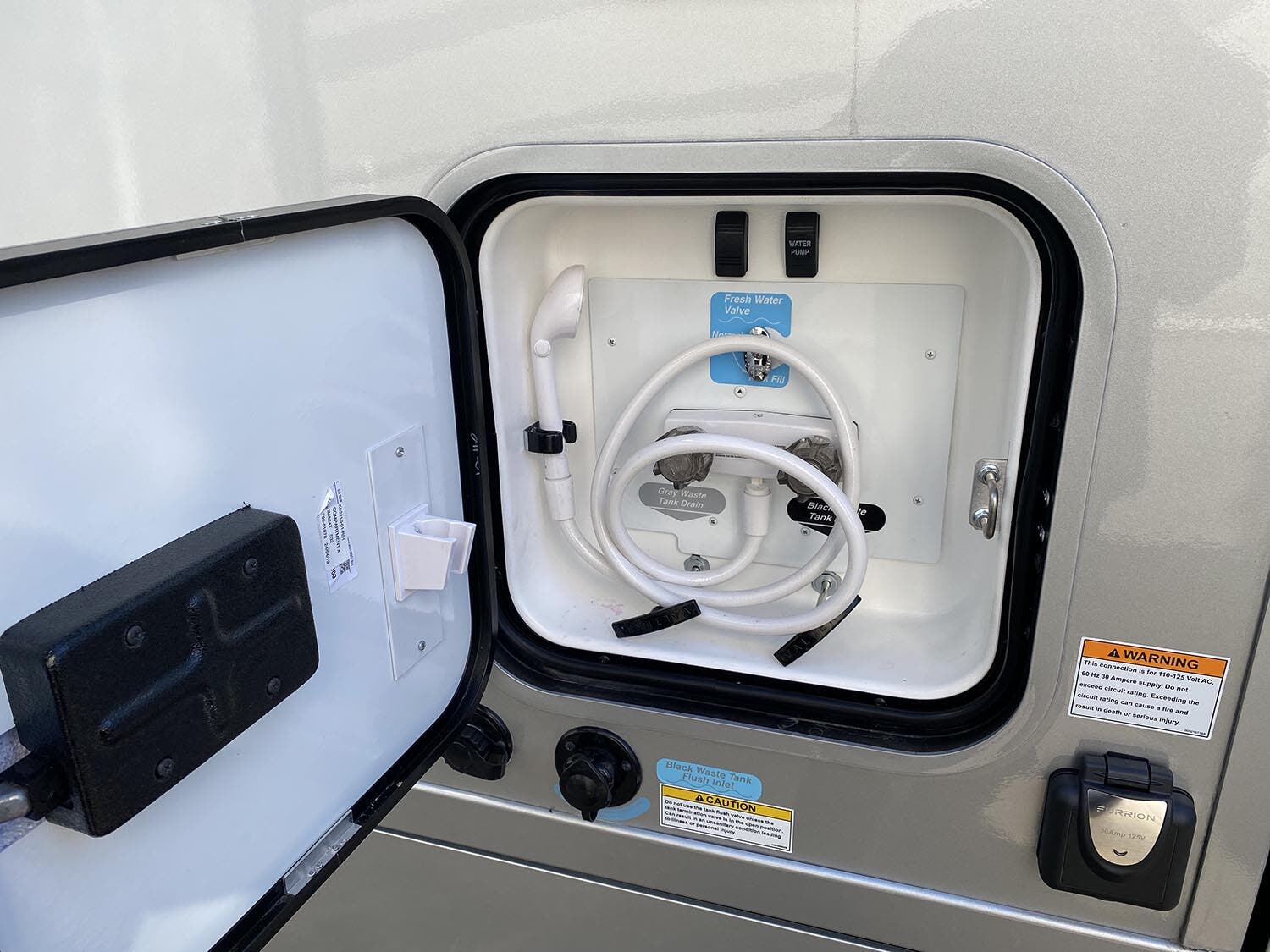 Insulated water service center houses color-coded labels, pressurized city water hookup/tank diverter valve, drainage valves, exterior wash station w/lighted pump switch • Truma AquaGo® Comfort Plus tankless water heater w/ recirculation pump • 12V heated drainage system • 10′ sewer hose • Winterization Package water heater bypass valve and siphon tube • On-demand water pump • Lockable water tank fill • Permanent-mount LP tank w/gauge • LPG accessory connection (patio area) • Black holding tank flushing system