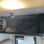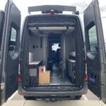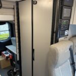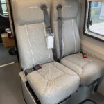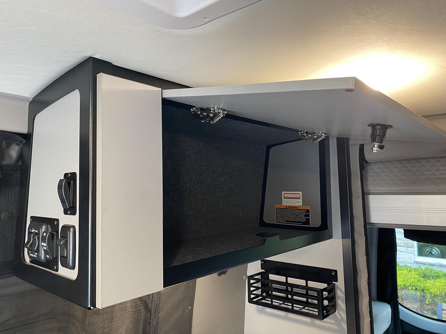 LED ceiling lights • Tinted dual-pane euro acrylic windows w/cassette shades • Front overhead cabinet shelf (cab area) • Systems monitor panel • Deluxe powered ventilator fan w/rain cover • RAM® Tough-Track™ mounts throughout • Forward facing lounge seat w/two integrated 3-point seat belts w/forward, recline and slide adjustments • Adjustable, removable table w/storage behind lounge seat • Entry door assist handle w/Ram® Tough-Track™ mount • 110V, 12V, USB-A and USB-C charging ports • Roof wiring access port • Heavy duty vinyl flooring throughout • Below floor storage (lounge)