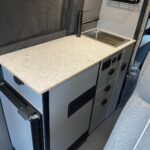Laminate countertop • Portable single burner induction cooktop • Galley drawer w/counter extension base (induction cooktop storage) • 3.0 cu. ft. (12V) single door compressor-driven refrigerator/freezer • Stainless steel sink w/single control faucet and pull-out sprayer • Spice rack