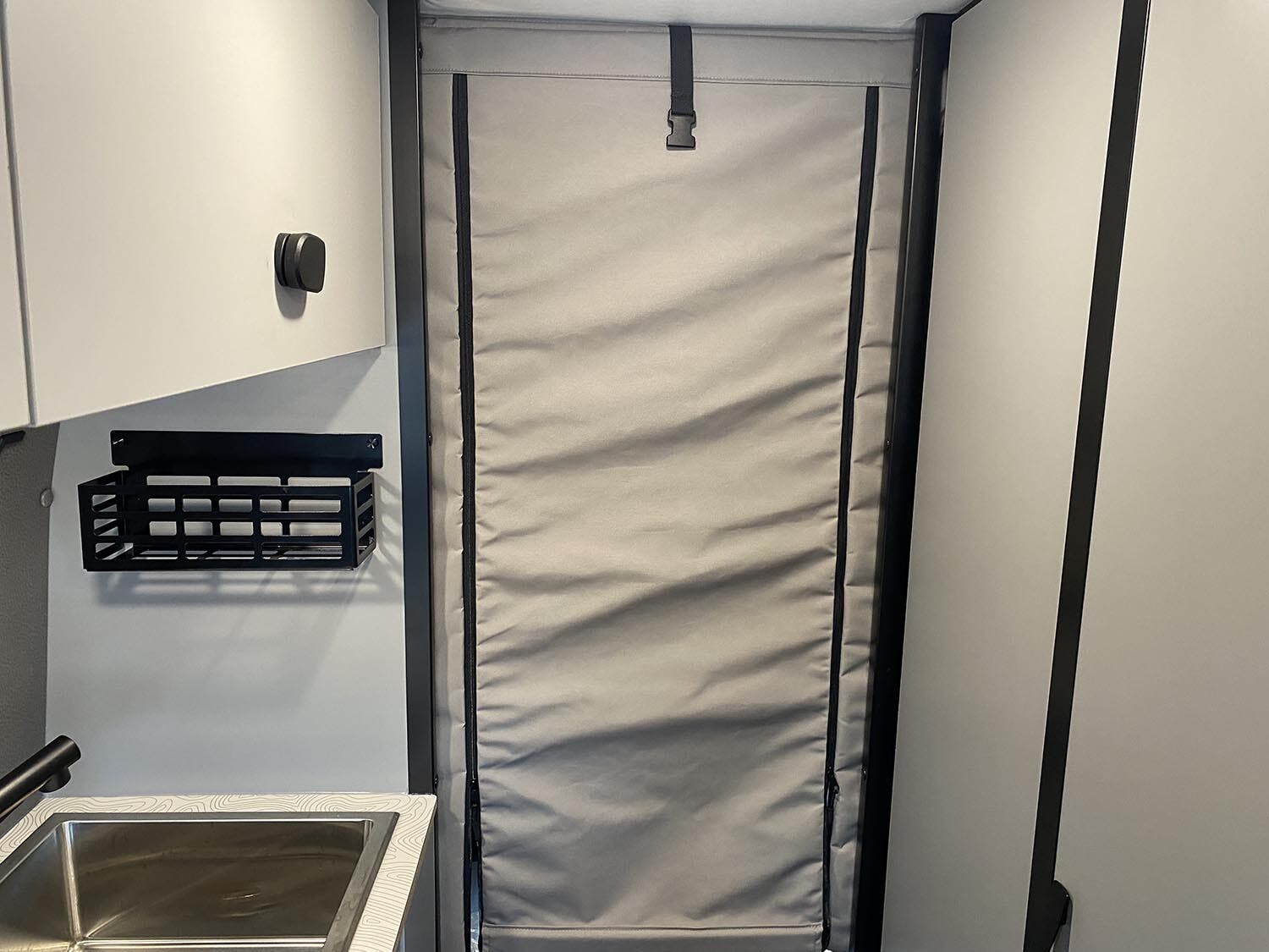 Wet bath 31″ x 26″ • Shower w/wall surround • Bi-fold bath door w/privacy panel extension • (1) removable shelf • (2) collapsible storage containers • Dual control faucet w/flexible shower head • Removable clothes rod • Mirror • Powered roof vent • Robe hooks • Shower curtain • Tissue holder • Swiveling cassette toilet