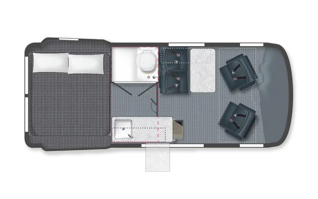 LED ceiling lights • Tinted dual-pane euro acrylic windows w/cassette shades • Front overhead cabinet shelf (cab area) • Systems monitor panel • Deluxe powered ventilator fan w/rain cover • RAM® Tough-Track™ mounts throughout • Forward facing lounge seat w/two integrated 3-point seat belts w/forward, recline and slide adjustments • Adjustable, removable table w/storage behind lounge seat • Entry door assist handle w/Ram® Tough-Track™ mount • 110V, 12V, USB-A and USB-C charging ports • Roof wiring access port • Heavy duty vinyl flooring throughout • Below floor storage (lounge)